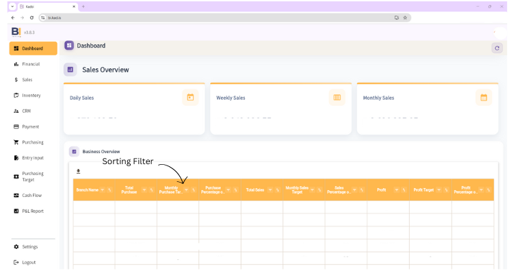 - Business Overview Table: Provides key metrics such as purchases, sales, targets, and profit.