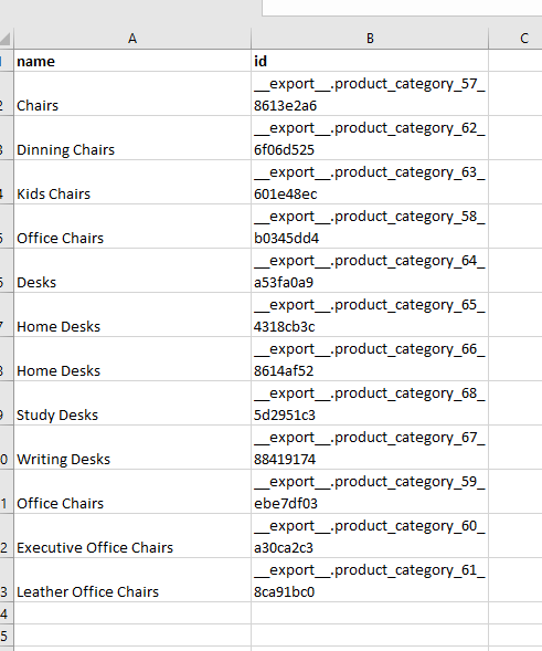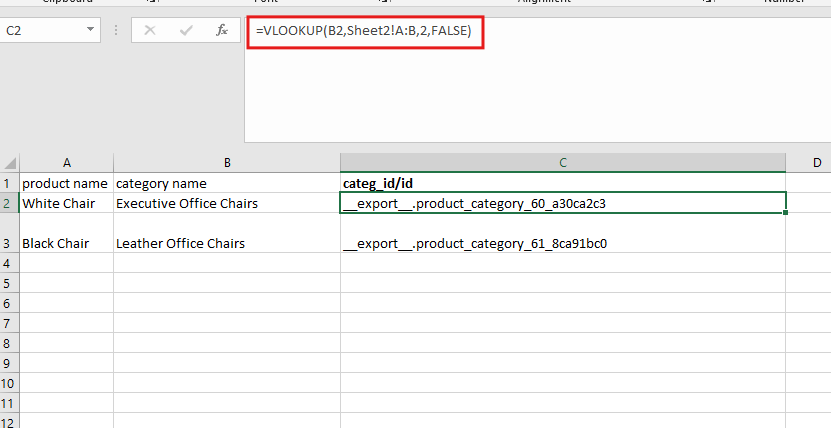 - Create a new sheet (Sheet2) and paste the exported categories and their external IDs there.