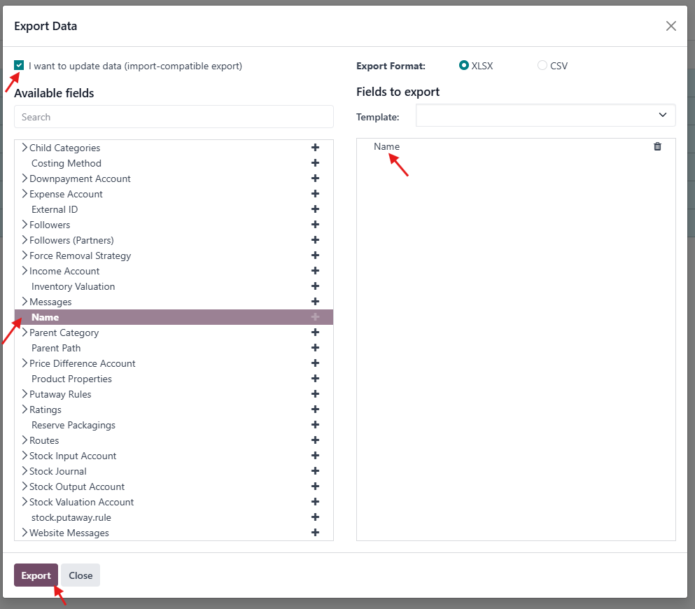 - Add a new column next to your Category Name column and name it: categ_id/id